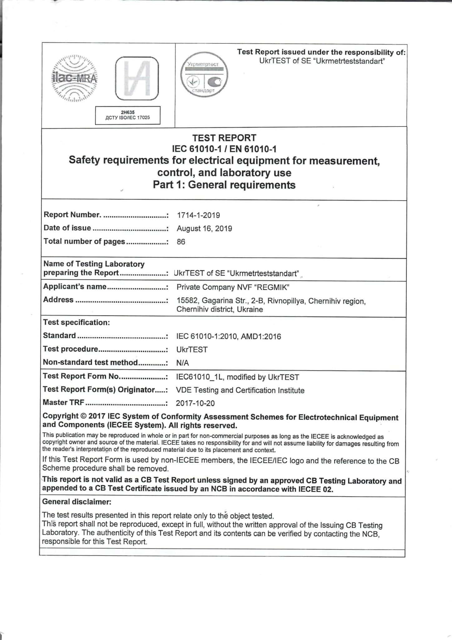- ДСТУ EN 61010-1: 2014 – Требования к безопасности контрольно-измерительного и лабораторного электрооборудования;ДСТУ EN 62479: 2015 – Оценка соответствия маломощного электронного и электрического оборудования базовым предельным уровням, связанным с воздействием электромагнитных полей на человека;